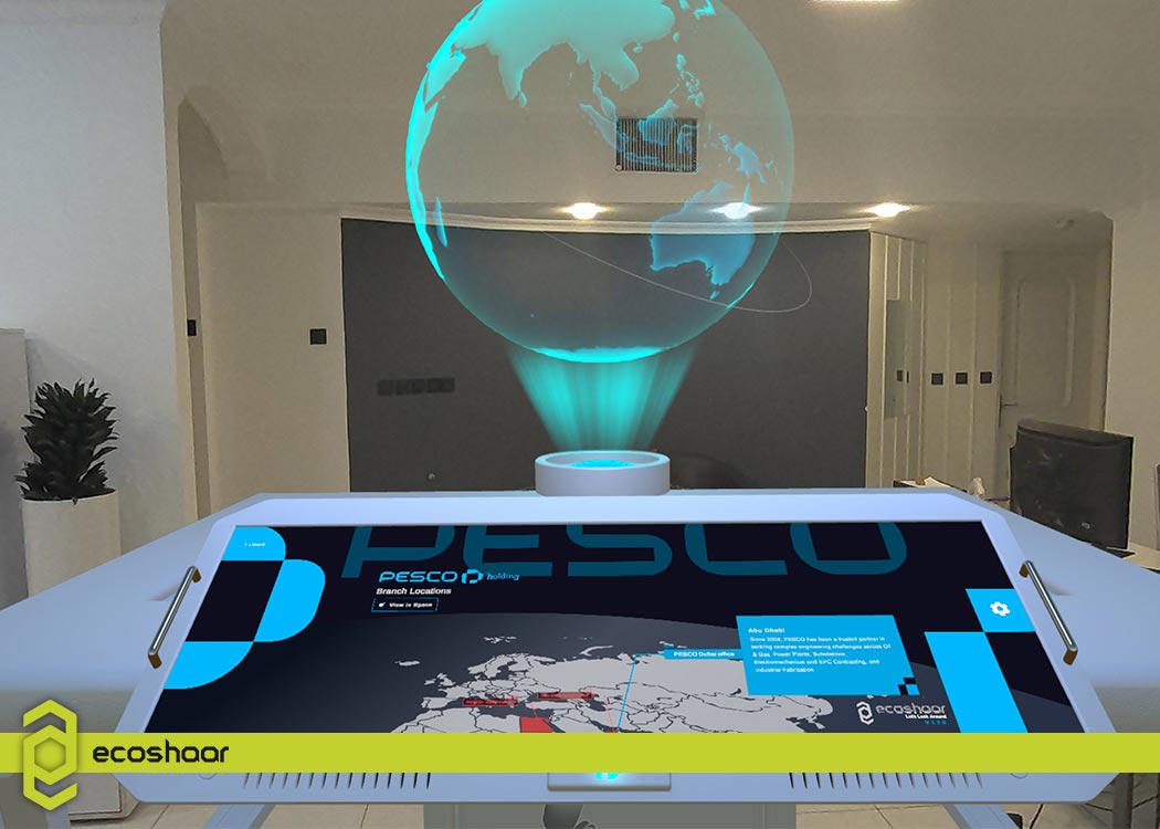 در ادامه؛ از طریق یک فضای شبیه سازی شده تعاملی، موقعیت شعب بینالمللی PESCO Holding در دبی، ابوظبی و مصر به نمایش درمیآید و کاربر در سفری کوتاه و مجازی میان این نقاط جغرافیایی حرکت میکند.